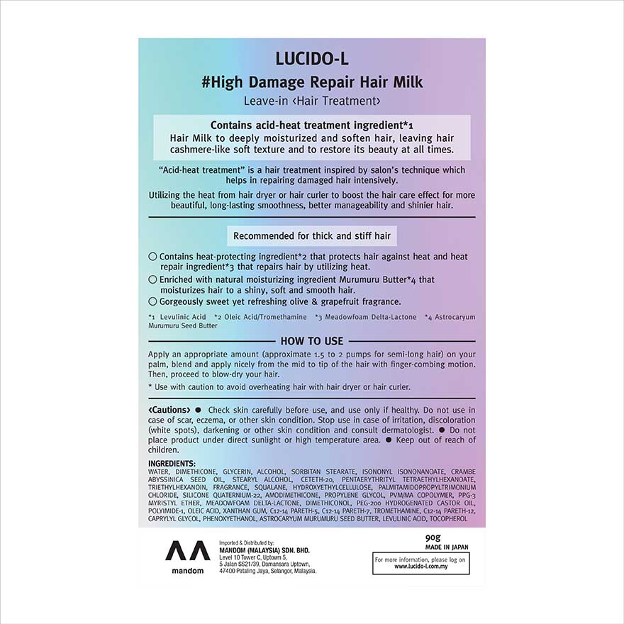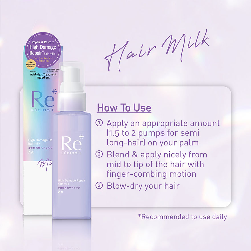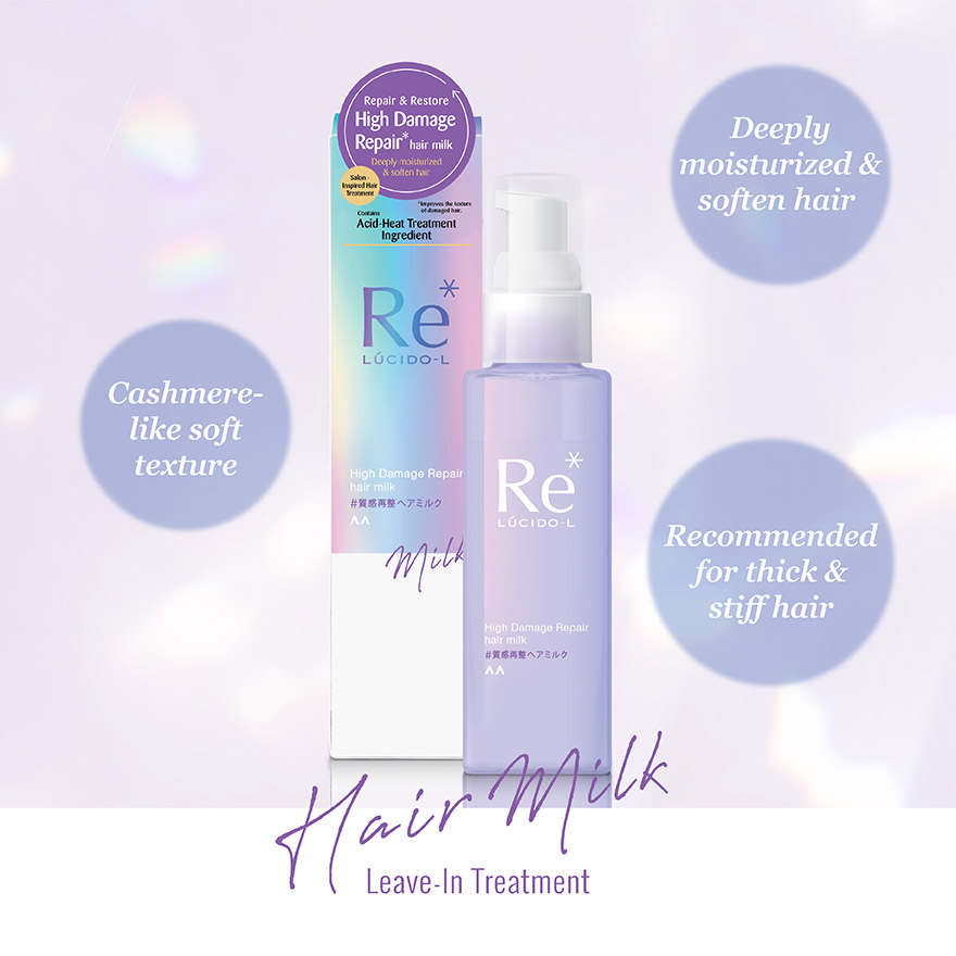 Lucido-L High Damaged Repair Hair Milk deeply moisturized & soften hair, leaving hair cashmere-like soft texture and to restores its beauty at all times. Using Acid-Heat Treatment, a heat treatment which inspired by salon's technique which helps in repairing damaged hair intensively. Utilizing the heat from hair dryer or hair curler to boost the hair care effect for more beautiful, long-lasting smoothness, better manageability and shinier hair. Recommended for thick and stiff hair. Contains heat-protecting ingredients that protects hair againts heat and heat repair ingredients that repairs hair by utilizing heat. Enriched with natural moisturizing ingredient Murumuru Butter that moisturizes hair to a shiny, soft and smooth hair. Gorgeously sweet yet refreshing olive & grapefruit fragrance.