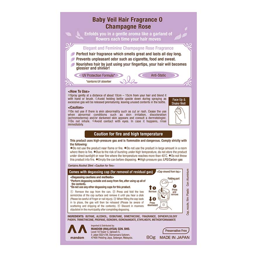 Baby Veil Hair Fragrance Champage Rose enfolds you in a gentle aroma like a garland of flowers each time your hair moves with elegant and feminine champage rose fragrance. Perfect hair fragrance which smells great and lasts all day long. Helps to prevent unpleasant odor such as cigarette, food and sweat. Nourishes hair by just using your fingertips, your hair will becomes glossier and shinier. It contains UV protection formula to protects your hair from ultraviolet rays and helps to anti-static.