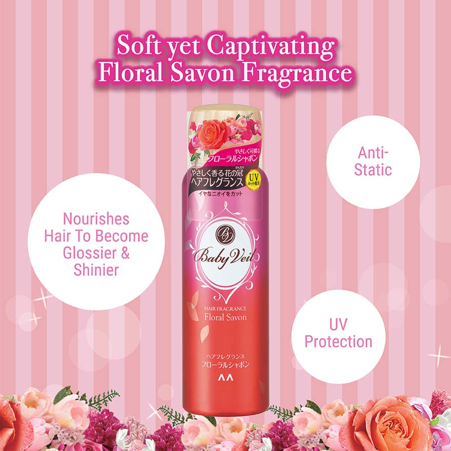 Baby Veil Hair Fragrance Floral Savon enfolds you in a gentle aroma like a garland of flowers each time your hair moves with soft yet captivating floral savon fragrance. Perfect hair fragrance which smells great and lasts all day long. Helps to prevent unpleasant odor such as cigarette, food and sweat. Nourishes hair by just using your fingertips, your hair will becomes glossier and shinier. It contains UV protection formula to protects your hair from ultraviolet rays and helps to anti-static.