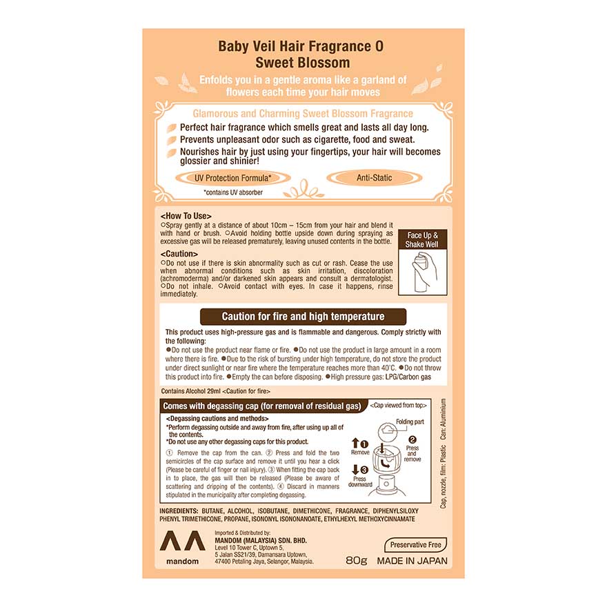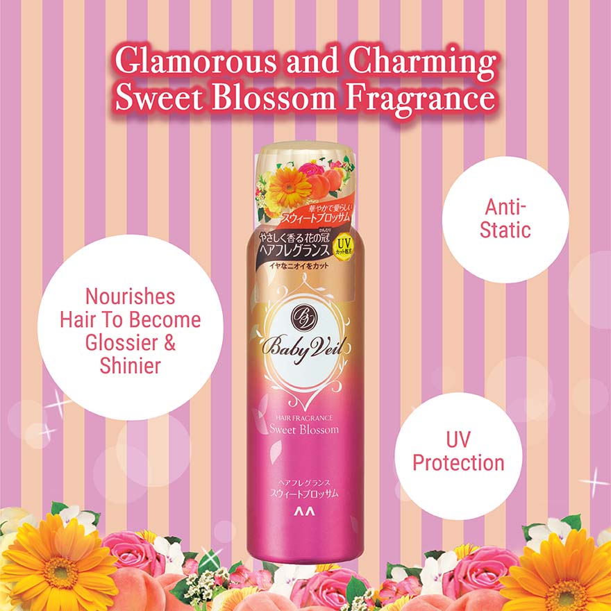 Baby Veil Hair Fragrance Sweet Blossom enfolds you in a gentle aroma like a garland of flowers each time your hair moves with glamorous and charming sweet blossom fragrance. Perfect hair fragrance which smells great and lasts all day long. Helps to prevent unpleasant odor such as cigarette, food and sweat. Nourishes hair by just using your fingertips, your hair will becomes glossier and shinier. It contains UV protection formula to protects your hair from ultraviolet rays and helps to anti-static.