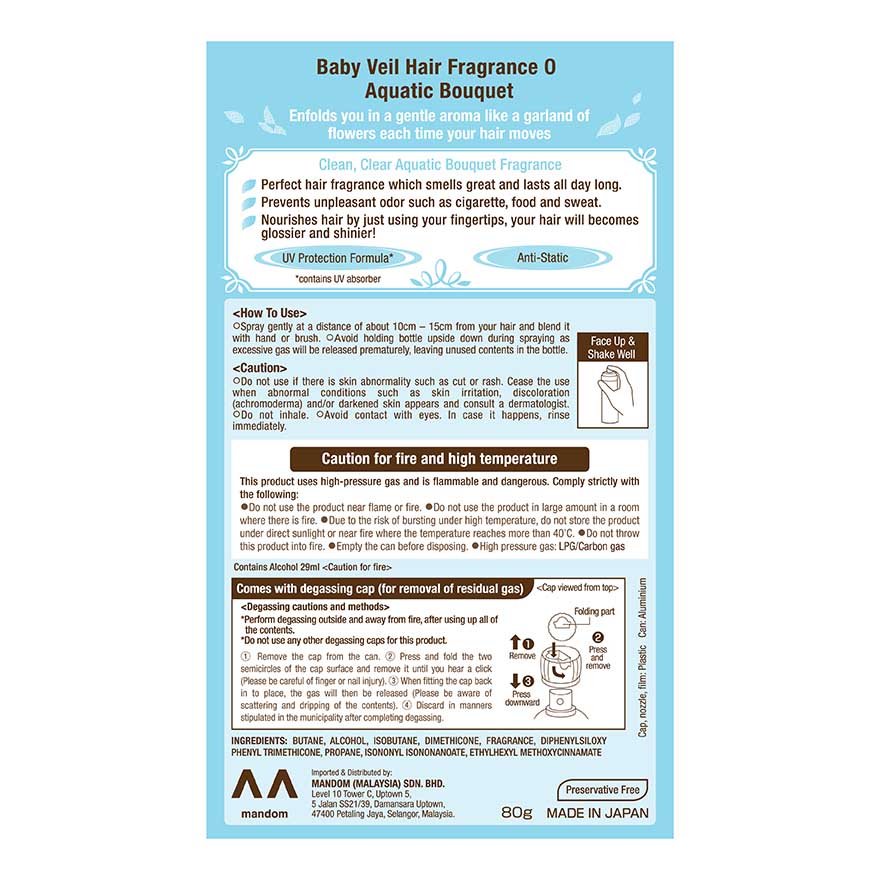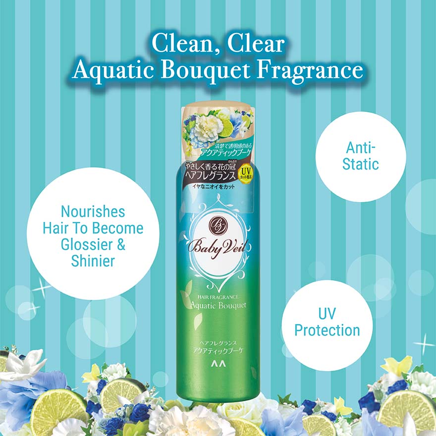 Baby Veil Hair Fragrance Aquatic Bouquet enfolds you in a gentle aroma like a garland of flowers each time your hair moves with clean, clear aquatic bouquet fragrance. Perfect hair fragrance which smells great and lasts all day long. Helps to prevent unpleasant odor such as cigarette, food and sweat. Nourishes hair by just using your fingertips, your hair will becomes glossier and shinier. It contains UV protection formula to protects your hair from ultraviolet rays and helps to anti-static.