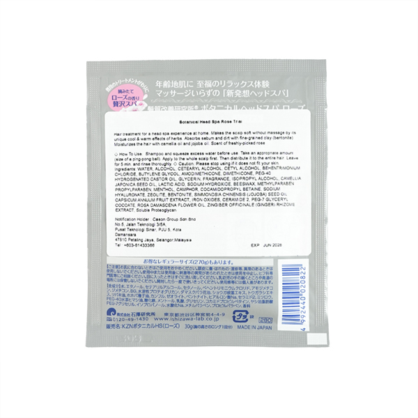 Hair treatment for a head spa experience at home. Makes the scalp soft without massage by its unique cool & warm effects of herbs. Absorbs sebum and dirt with fine-grained clay (bentonite). Moisturizes the hair with camellia oil and jojoba oil. Scent of freshly-picked rose.
