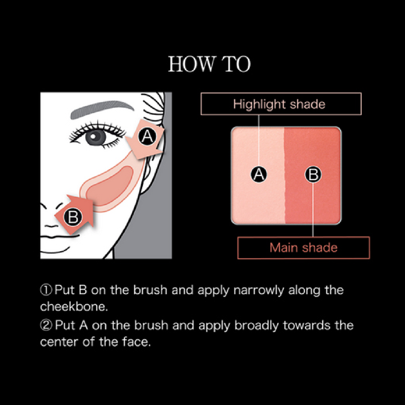 Highlight cheek bones with lighter shade, then sweep darker shade over apples of the cheek for a rosy finish