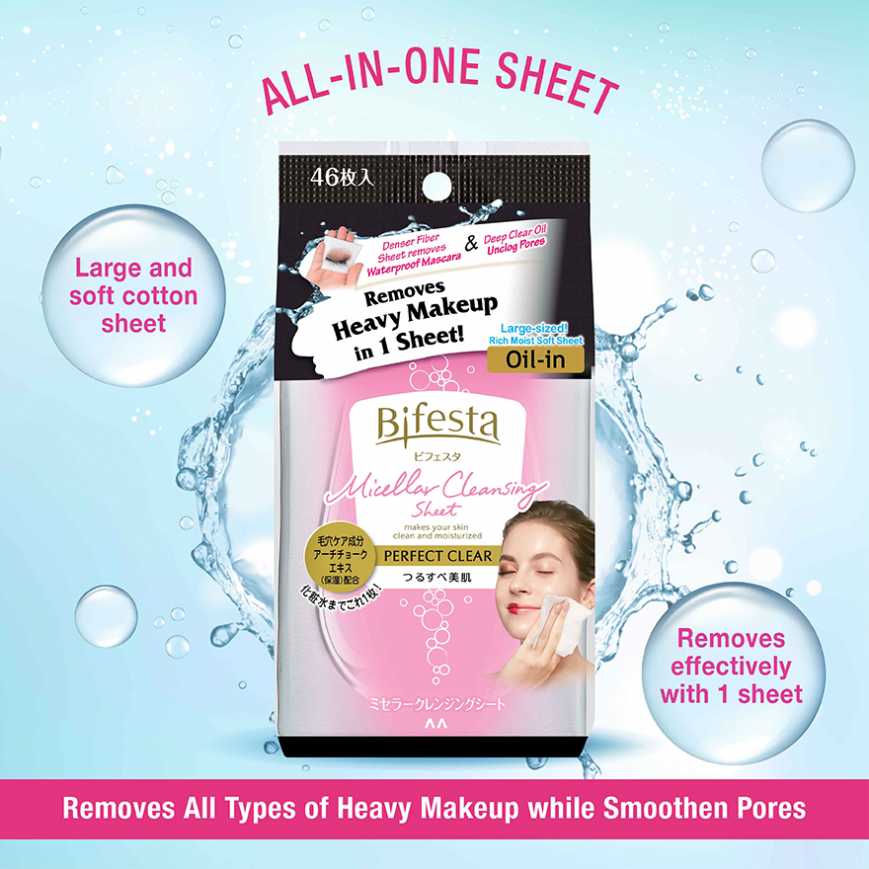 Bifesta Micellar Cleansing Sheet Perfect Clear is a makeup remover wipes that Removes All Types of Heavy Makeup while Smoothen Pores. It contains Deep Clear Oil (Moisturizer)/ Artichoke Extract (Pore Care Ingredient) which suitable for Heavy Makeup user. Formulated through a lotion-derived cleansing ingredients & deep clear oil that wrap & lift the makeup & dirt quickly without scrubbing, provides ample moisture while cleansing thoroughly. Large & soft cotton sheet which is able to wipe off entire face makeup with just one sheet! Airtight plastic cap is specially designed to retain moisture of cotton sheet for a longer period. Low friction formula to prevent skin irritation while wiping. Fragrance free & colorant free, hypoallergenic formulation (friendly to sensitive skin).