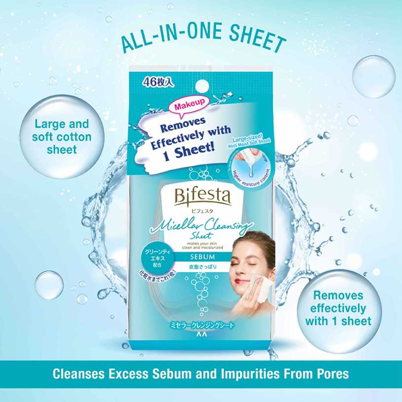 ■Description Bifesta Micellar Cleansing Sheet Sebum is a makeup remover wipes that Cleanses Excess Sebum and Impurities from Pores. It contains Green Tea Extract (Skin Toner)/ Adsorptive Hyaluronic Acid (Moisturizer) which suitable for Oily Skin with Large Pores & Excess Sebum. Formulated through a ...Read more