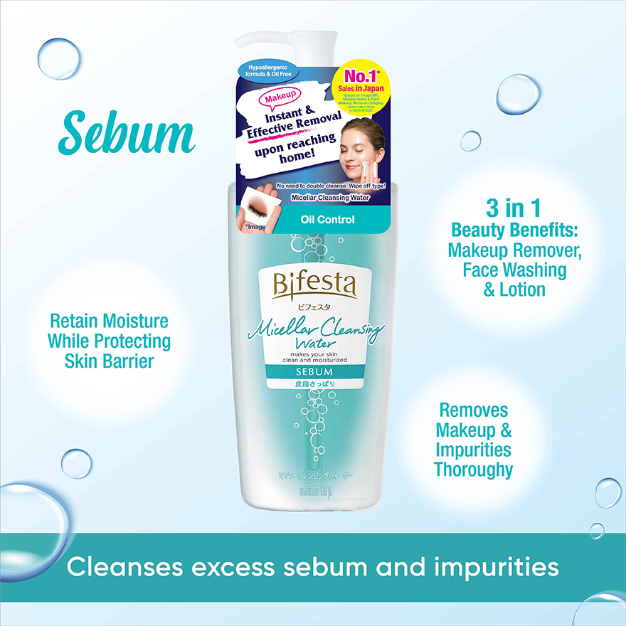 Bifesta Micellar Cleansing Water Sebum is gentle yet powerful thoroughly removes makeup and dirt. Bifesta Micellar Cleansing Water Sebum consists of green tea extract to cleanses excess sebum and impurities from pores. It also come with moisturizing absorptive Hyaluronic Acid that makes your skin feel freshly moisturized skin protected from dryness. It consists 3-in-1 beauty benefits: Multi functions formula cleanses skin, removes makeup and moisturizes skin all in one simple step. No oil, colorant, fragrance and alcohol. Hypoallergenic formulation which is friendly to sensitive skin.