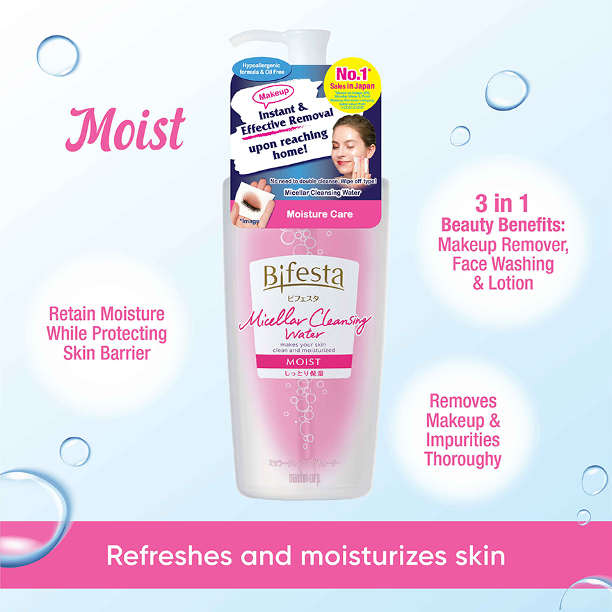 Bifesta Micellar Cleansing Water Moist is gentle yet powerful thoroughly removes makeup and dirt. Bifesta Micellar Cleansing Water Moist consists two types of moisturizing ingredients (Adsorptive Amino Acid and Hyaluronic Acid) that makes your skin feel freshly moisturized skin protected from dryness. It consists 3-in-1 beauty benefits: Multi fucntions formula cleanses skin, removes makeup and moisturizes skin all in one simple step. No oil, colorant, fragrance and alcohol. Hypoallergenic formulation which is friendly to sensitive skin.