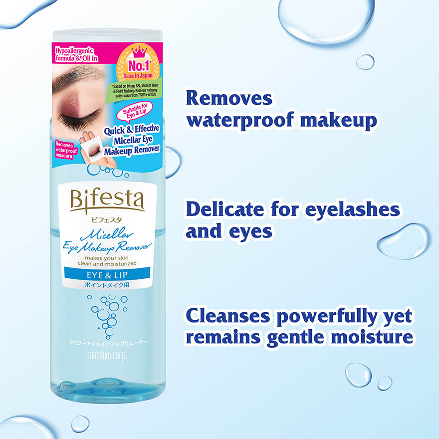 Bifesta Micellar Eye Makeup Remover consists dual effect of water layer which include lotion-based cleansing ingredients and oil-based emollient layer quickly lifts and removes waterproof eyes and lips makeup effortlessly without rubbing and tugging. It contains two types of moisturizing ingredients (Vitamin B derivative and Vitamin E derivative) which is delicate for eyelashes and eyes area. No colorant, fragrance and paraben. Hypoallergenic formulation which is friendly to sensitive skin.