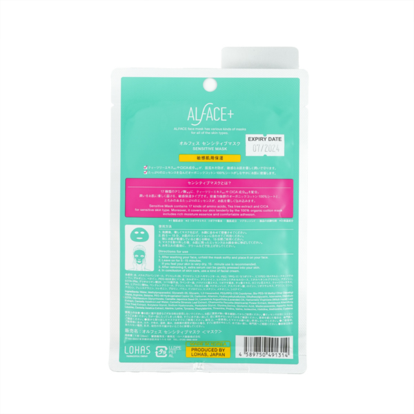 ALFACE Sensitive Mask is a 100% organic cotton sheet mask that contains CICA ingredients to prevent rough skin! Specially for overworked sensitive skin, it gently moisturises and protects your skin. It refreshes the skin with the scent of lavender and herbs. Made in Korea, formulated in Japan.
