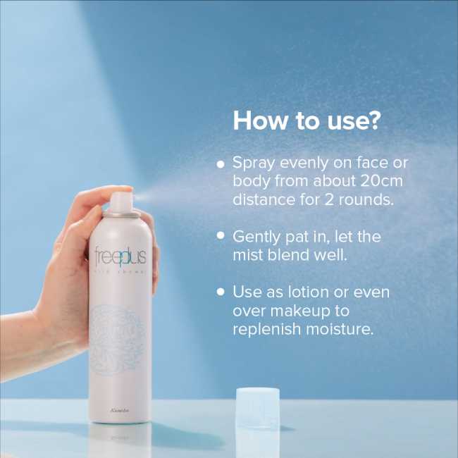 Spray evenly on face or body with a distance of about 20cm away, then genty spread and pat the lotion with your hand