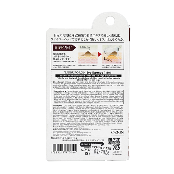 Tsubuporon Eye Essence from Japan is a warm gel that targets skin tags around your eyes. Developed for white oily dead cells on eyes. 22 Japanese extracts gives you extra care on the delicate skin around your eyes— with a soft fiber stick for easy application. Compared to skin tags on the neck, it is more oily and more noticeable