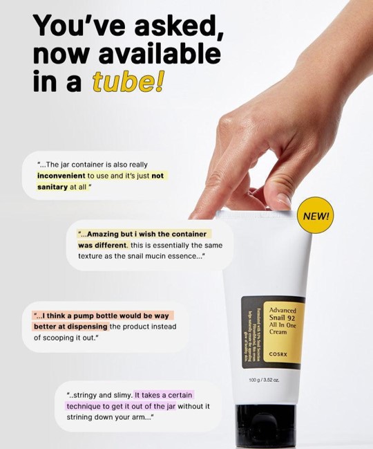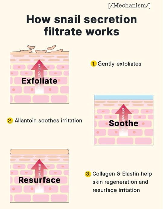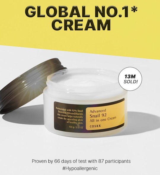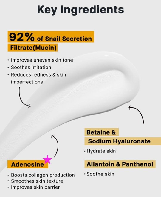 Snail Secretion Filtrate, Betaine, Caprylic/Capric Triglyceride, Butylene Glycol, Cetearyl Olivate, Sorbitan Olivate, Cetearyl Alcohol, Carbomer, Ethyl Hexanediol, Phenoxyethanol, Arginine, Dimethicone, Sodium Polyacrylate, Sodium Hyaluronate,Allantoin, Palmitic Acid, Panthenol, Xanthan Gum, Stearic acid, Adenosine, Water, Myristic Acid