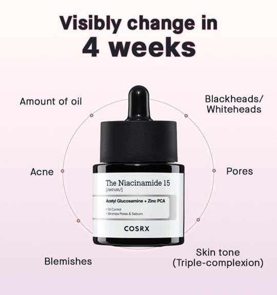 Total acne care with 15% niacinamide.The highly concentrated 15% niacinamide serum formula is blended with Acetyl Glucosamine and Zinc PCA for comprehensive acne care, with a texture that allows for easy absorption into the skin. This optimal ratio of synergistic ingredients also helps address excess oil, uneven skin tone, lack of radiance, and rough skin texture.