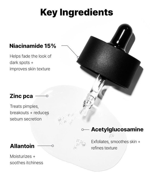 Water, Pentylene Glycol, Niacinamide(15%), Butylene Glycol, Acetyl Glucosamine, 1,2-Hexanediol, Zinc PCA, Trehalose, Xanthan Gum, Pullulan, Allantoin, Ethylhexylglycerin, Sodium Phytate, Citric Acid, Tocopherol