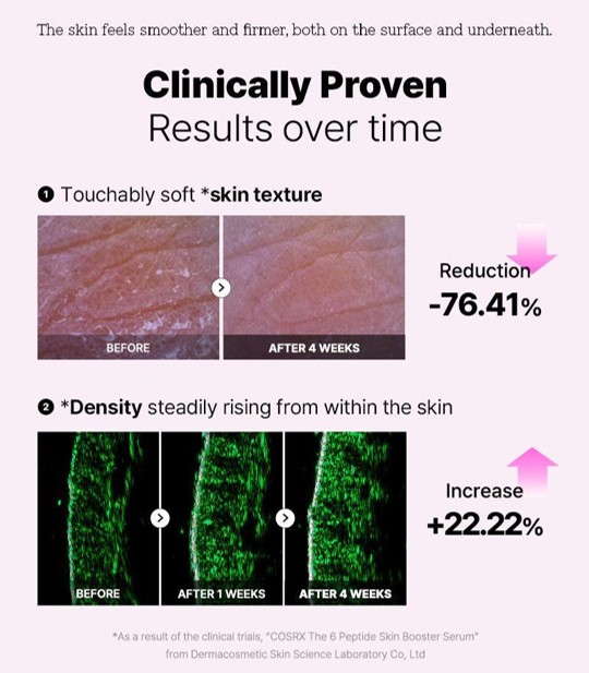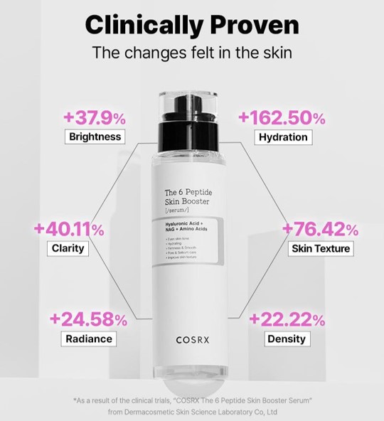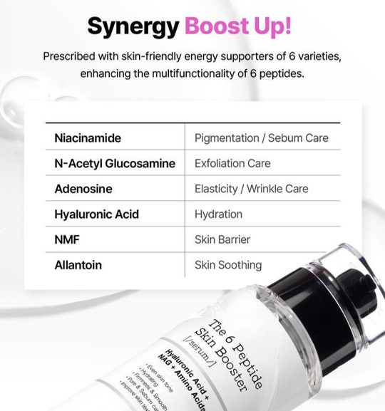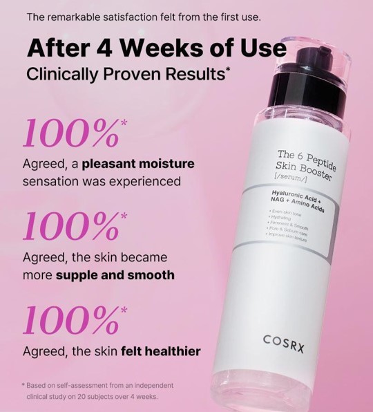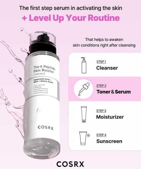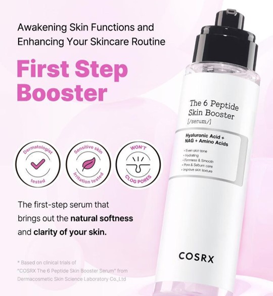 COSRX The 6 Petide Skin Booster is suitable for all skin types and can be used all day and in any season. It is especially ideal for those seeking a lightweight, non-sticky serum to enhance their original skincare routine. Additionally, it is perfect for individuals with complex skin concerns, including those who want to address multiple skin issues like pores, excess sebum, fine lines, and uneven skin texture and tone.